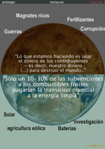 Los impuestos subvencionan la destrucción del planeta en lugar de salvarlo (petróleo, pesca y agricultura intensiva, etc.). Este es uno de los temas que se debatirán en la COP 29 del 11 al 22 de noviembre de 2024.