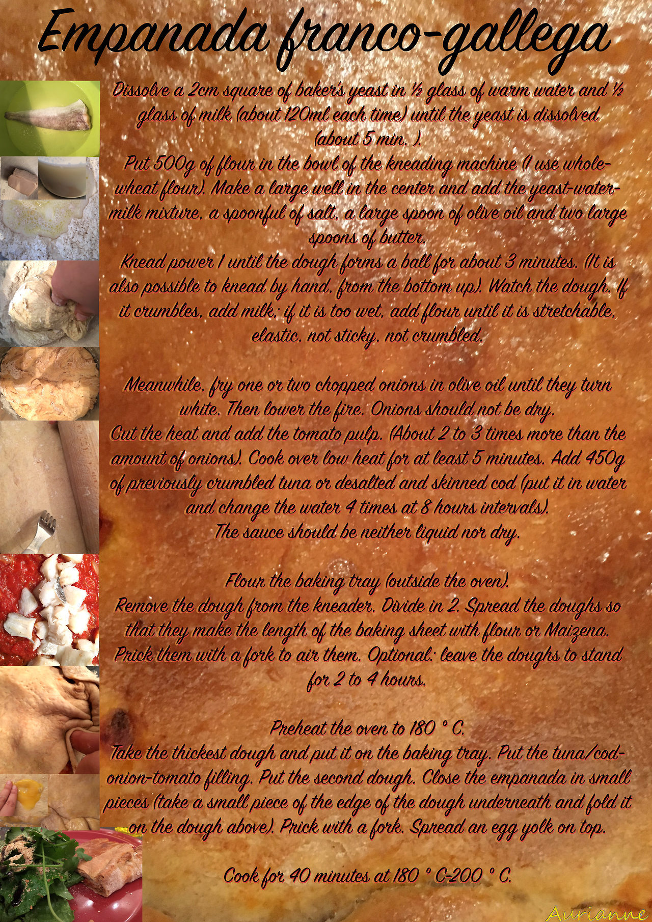 As soon as I was old enough to cook, I wanted to know how to cook the famous dish. I did not understand the mixture of Galician and Spanish my abuela used to babble, not knowing the difference between the two languages; and my Spanish was not good enough to understand the translation by my aunt who was issuing an incredible number of instructions at lightning speed. Whether my abuelita or aunty, they went too fast, without measuring anything, without weighing anything. Everything was done in the eye, and, what was most important, in very large quantities. They explained to me in the slightest details certain parts of the recipe and then told me to leave while the dough was resting and, when I came back, everything was ready to go to the oven.