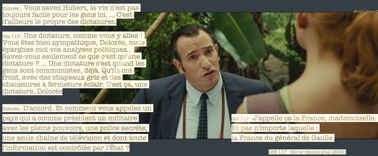 Oss 117 : Une dictature, comme vous y allez ! Vous êtes bien sympathique, Dolorès, mais épargnez-moi vos analyses politiques… (Temps.) Savez-vous seulement ce que c’est qu’une dictature ? (Temps.) Une dictature c’est quand les gens sont communistes, déjà. Qu’ils ont froid, avec des chapeaux gris et des chaussures à fermeture éclair. C’est ça, une dictature, Dolorès.