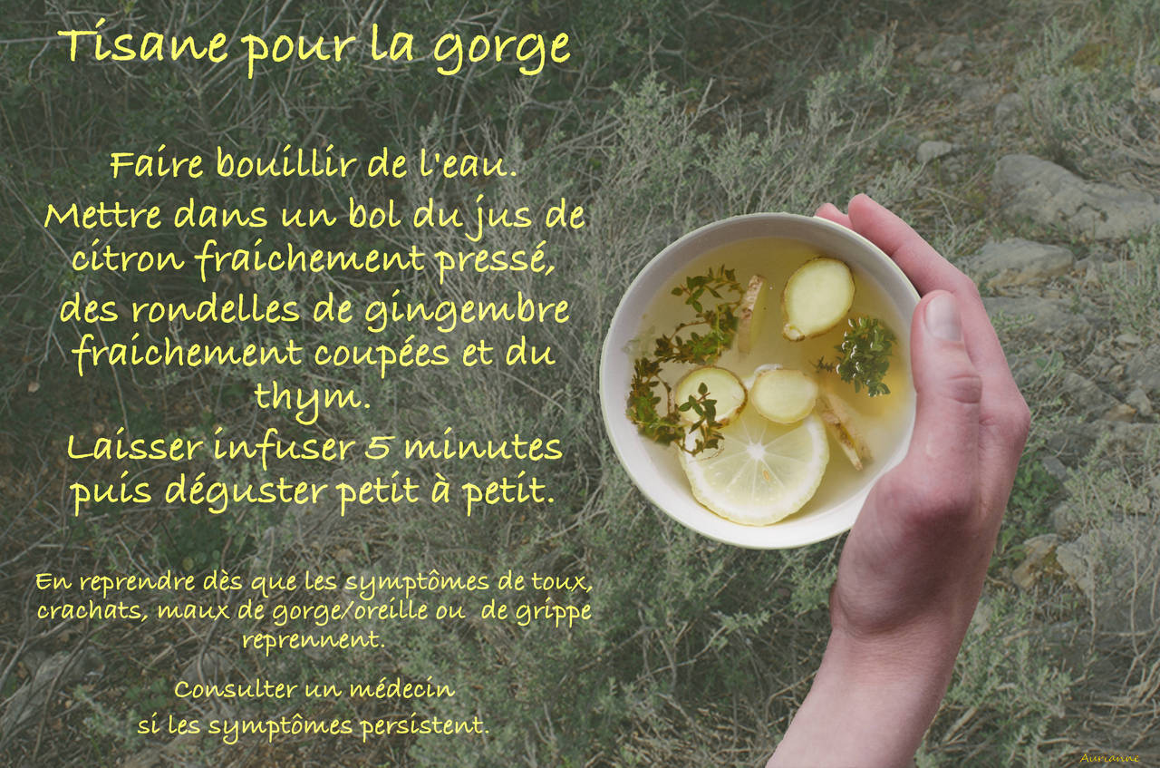Faire bouillir de l’eau. Mettre dans un bol du jus de citron fraîchement pressé, des rondelles de gingembre fraîchement coupées et du thym. Laisser infuser 5 minutes puis déguster petit à petit. Vous pouvez ajouter du miel. En reprendre dès que les symptômes de toux, crachats, maux de gorge/oreille ou de grippe reprennent. Consulter un…