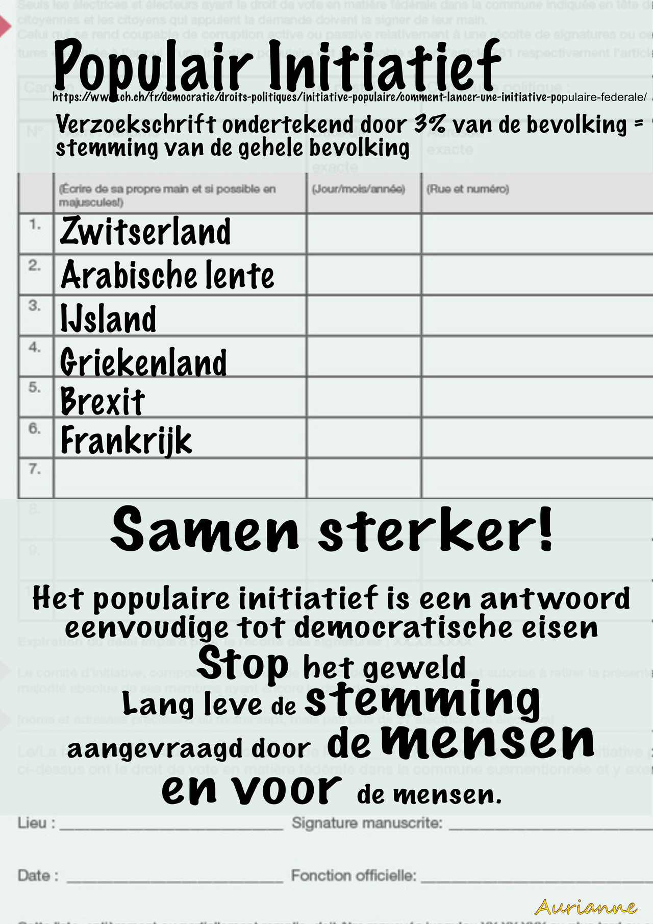Popular Initiative Translate with: https://www.deepl.com/translator Vertaal met: https://www.deepl.com/translator Comment lancer une initiative populaire fédérale en Suisse?: https://www.ch.ch/fr/democratie/droits-politiques/initiative-populaire/comment-lancer-une-initiative-populaire-federale/ Qu’est-ce qu’une initiative populaire fédérale ?: https://www.ch.ch/fr/democratie/droits-politiques/initiative-populaire/quest-ce-quune-initiative-populaire-federale/