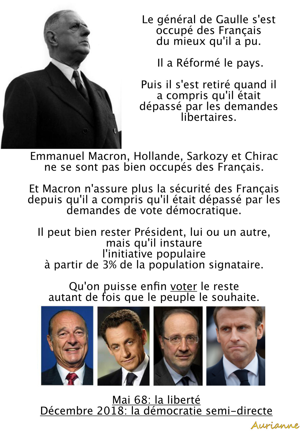 La Vème République française donne trop de pouvoir au président qui peut se comporter comme un monarque sans écouter les demandes du peuple. Grâce au 49.3, il peut faire passer des décrets sans l’avis du parlement élu. Il peut choisir son premier ministre sans tenir compte du vote des gens. Il peut réprimer les manifestants sans écouter leurs revendications.